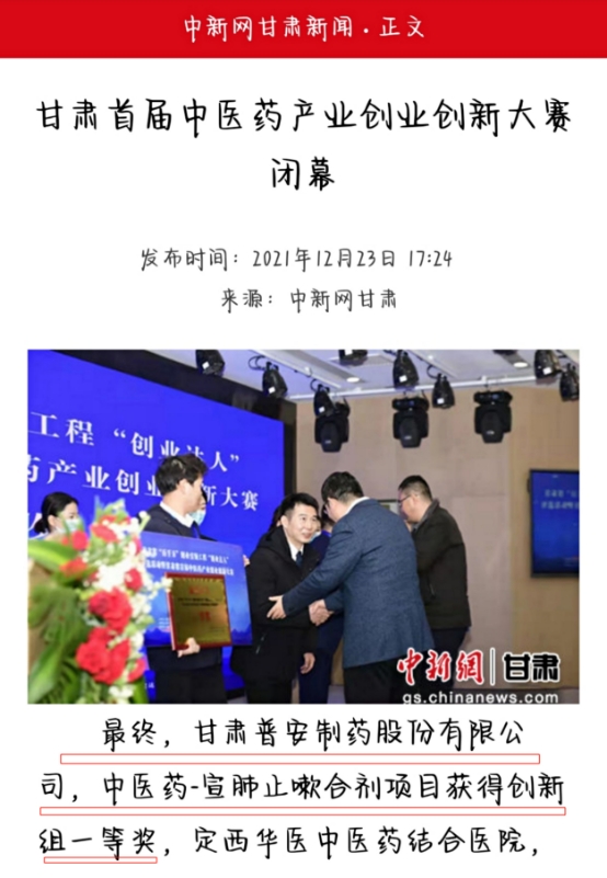 多家媒體爭相報道,“甘肅普安制藥股份有限公司榮獲甘肅省首屆中醫(yī)藥產(chǎn)業(yè)創(chuàng)業(yè)創(chuàng)新大賽創(chuàng)新組第一”強勢霸屏