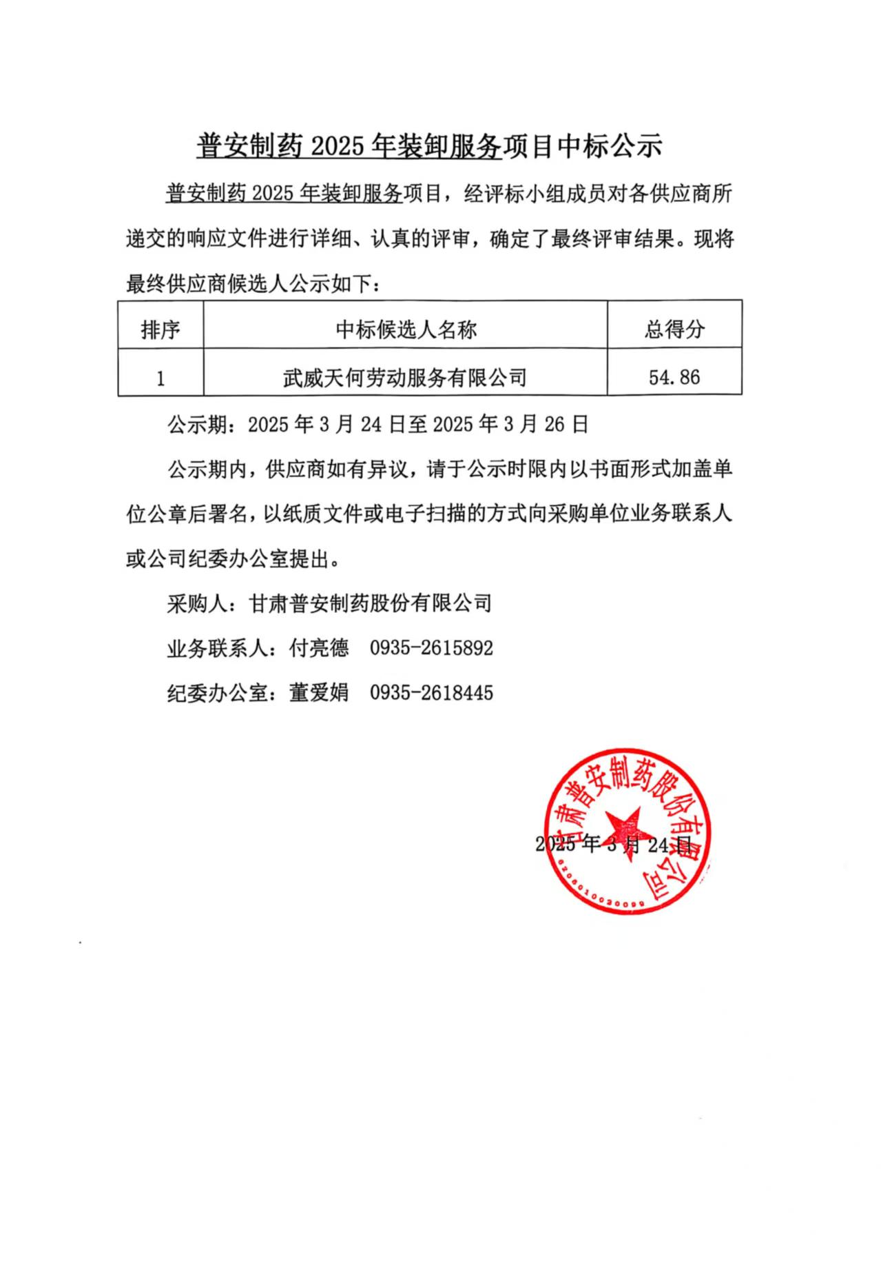 普安制藥 2025 年裝卸服務(wù)項目中標(biāo)公示