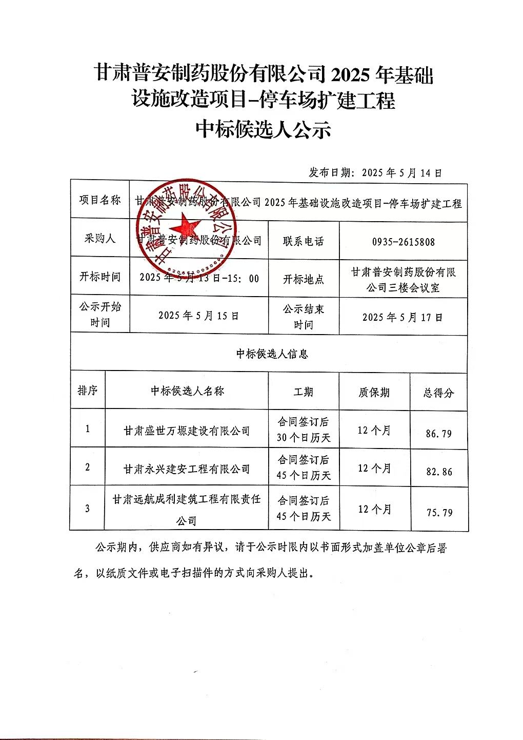 甘肅普安制藥股份有限公司2025年基礎(chǔ)設(shè)施改造項目——停車場擴建工程中標(biāo)候選人公示