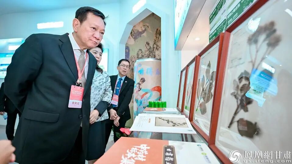 泰國公共衛(wèi)生部部長顧問科希特•蘇維尼吉(左一)走進甘肅藥業(yè)集團展館,了解中藥材標準化種植基地建設情況。李德宇 攝