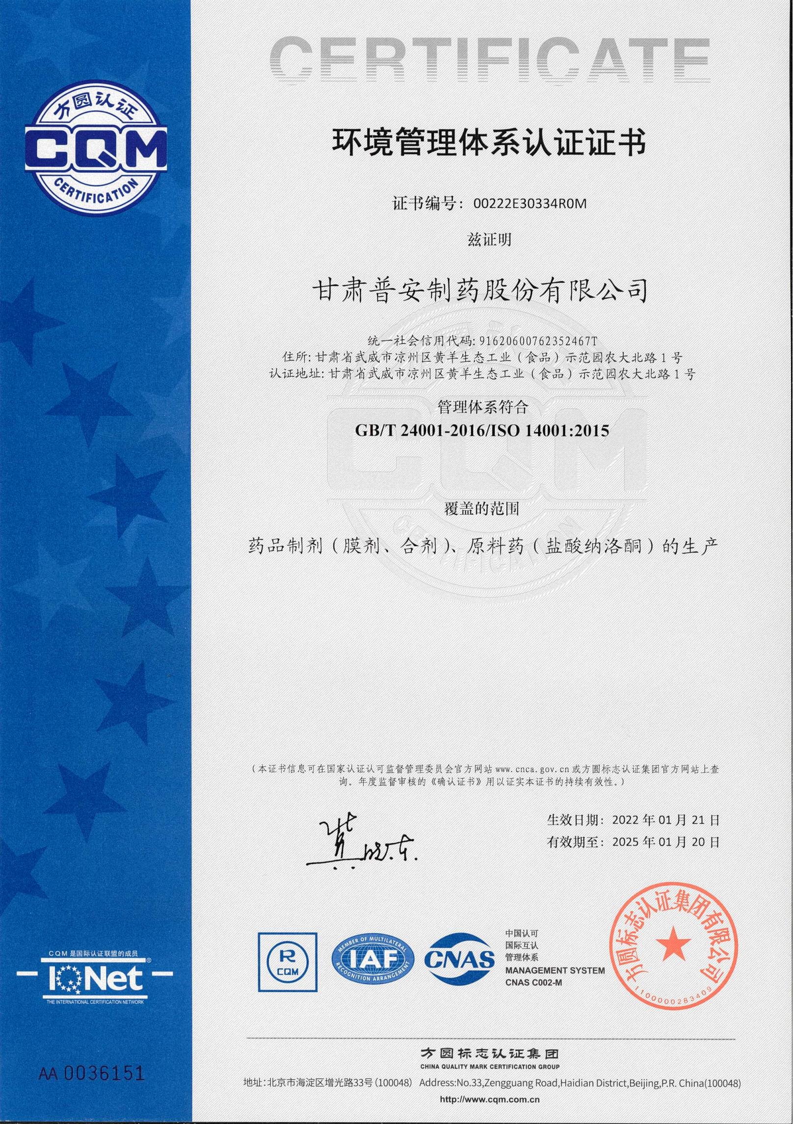 環(huán)境管理體系認(rèn)證證書