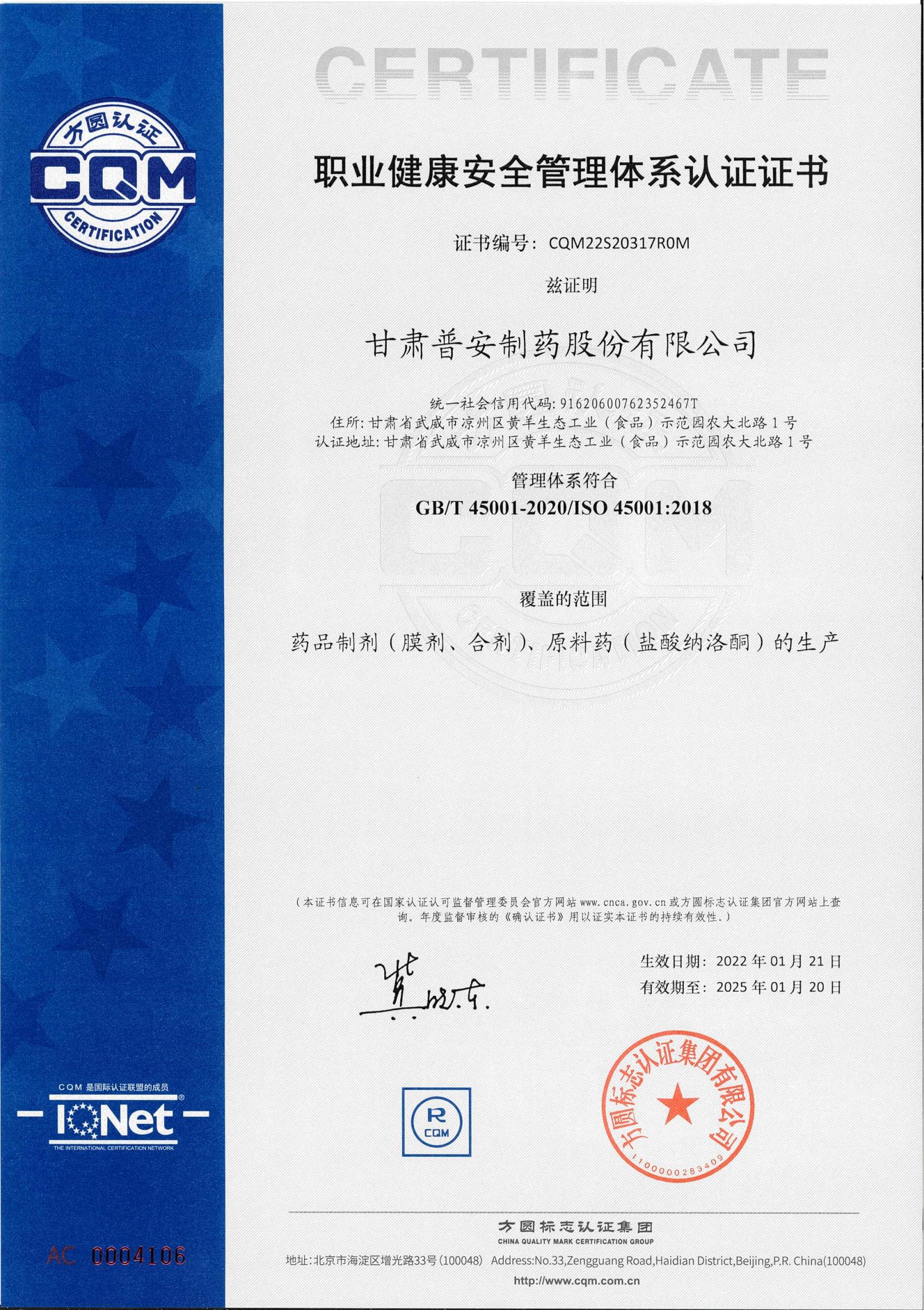 職業(yè)健康安全管理體系認(rèn)證證書