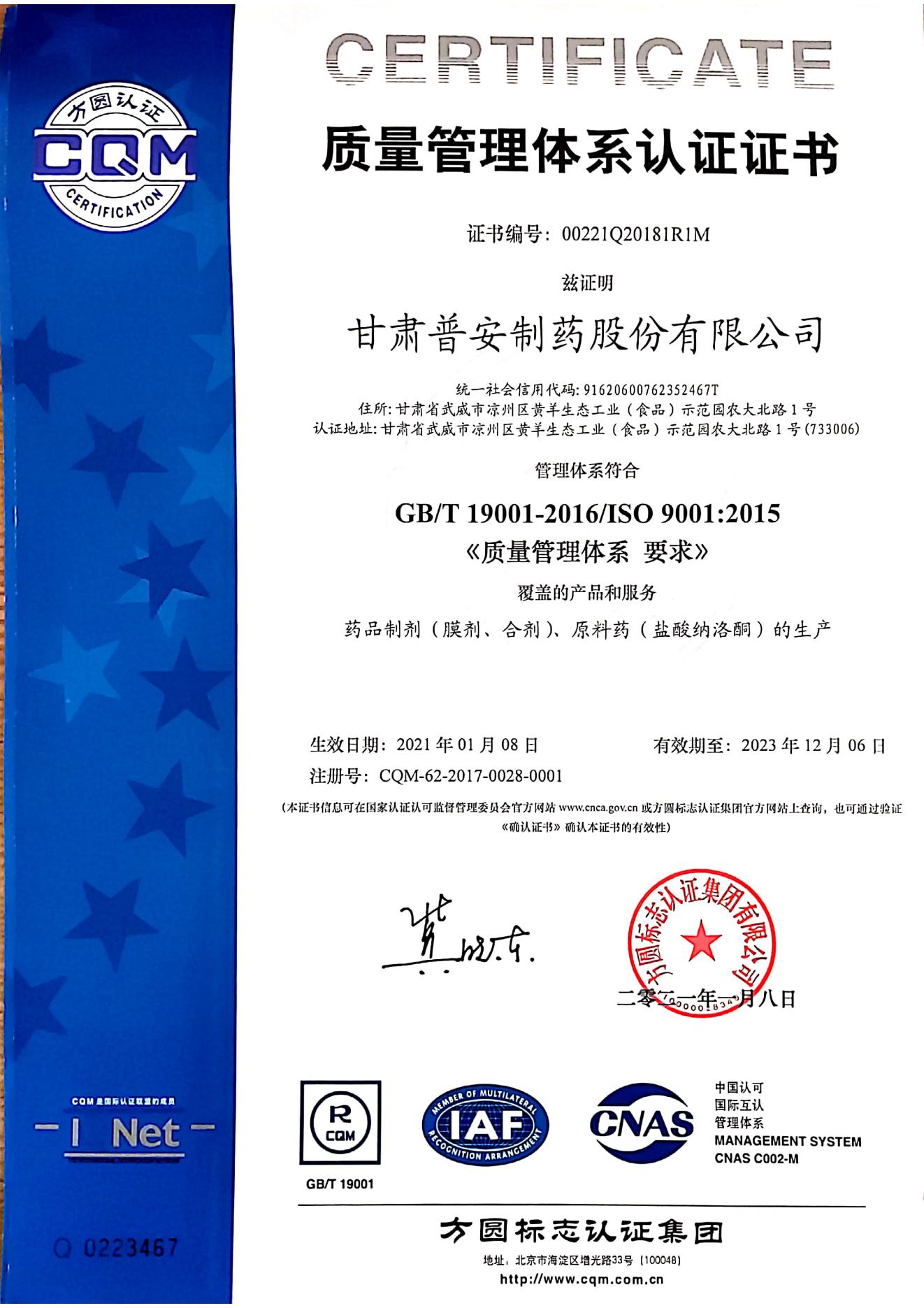 質(zhì)量管理體系認(rèn)證證書